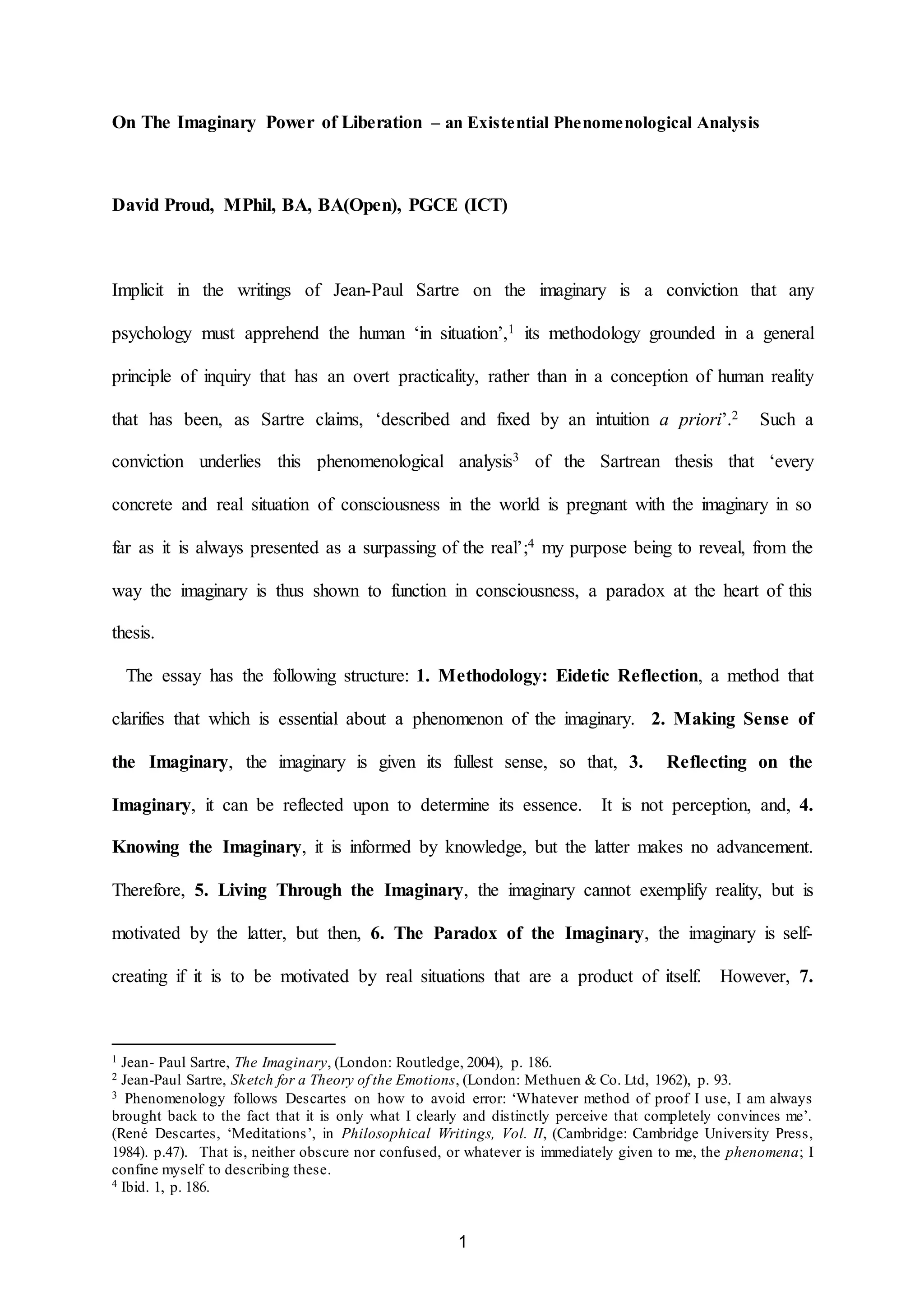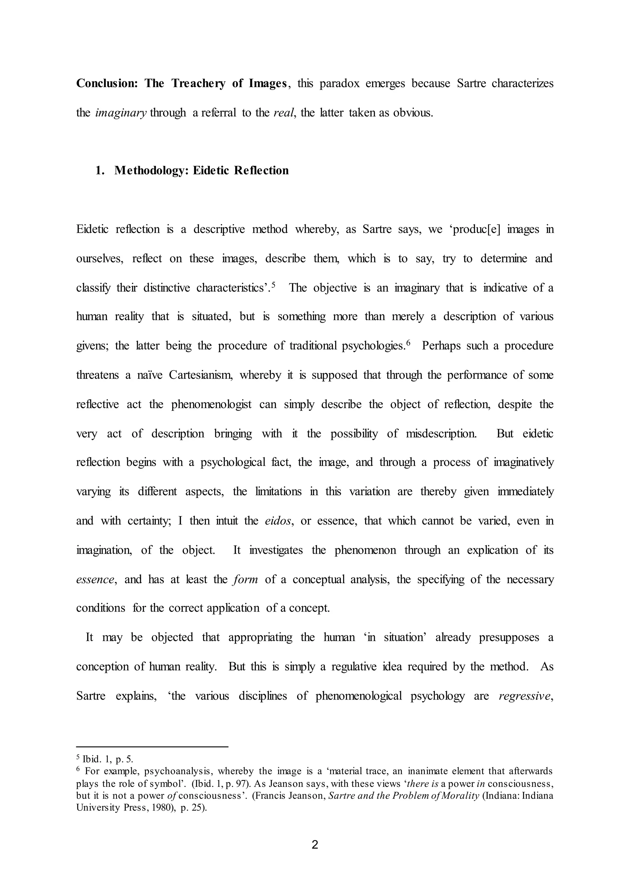 This document provides a phenomenological analysis of Jean-Paul Sartre's thesis on the imaginary. It summarizes:
