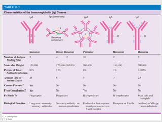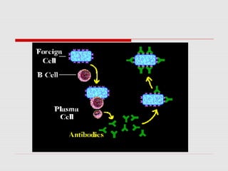 The document discusses the two types of immune responses: cell-mediated (CMI) and humoral, detailing their mechanisms and phases. CMI involves T-cells and macrophages responding to intracellular pathogens, while the humoral response produces antibodies against foreign antigens. Key components include antigen processing, cytokine signaling, and the roles of various T-cell subsets and antibody classes in immunity.