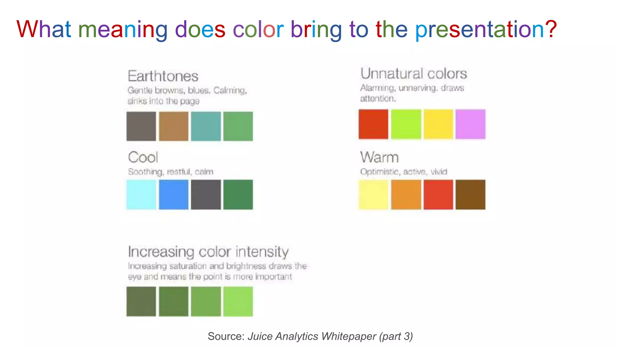 This document discusses the effective use of color in data visualization. It explains that color can be used to convey meaning but too much color can overload short-term memory. There are different types of color schemes like sequential, diverging, and categorical that are suited to different data types. It also discusses color vision deficiencies which affect approximately 8% of men and influence how they perceive certain colors. The document provides examples of how colorblind individuals see color compared to those with normal vision and recommends testing visualizations using colorblind simulators.