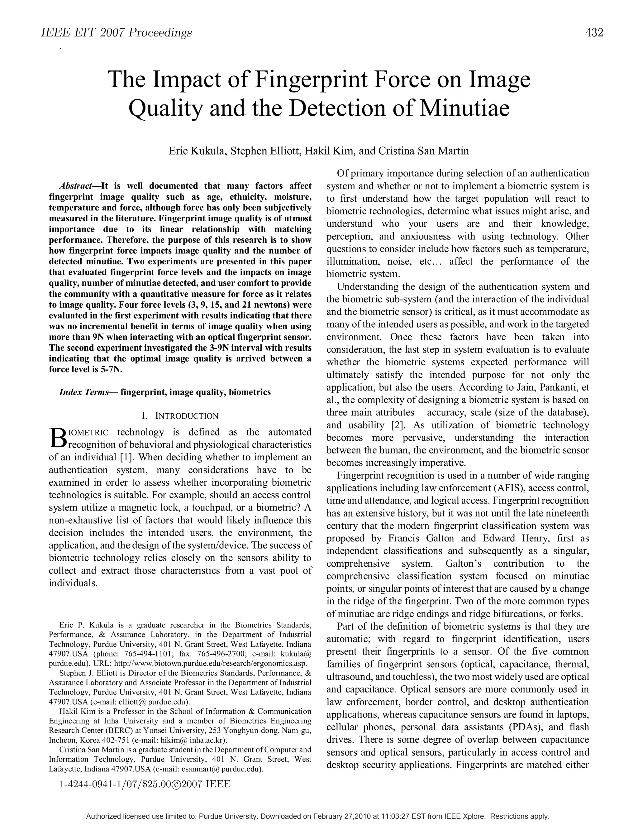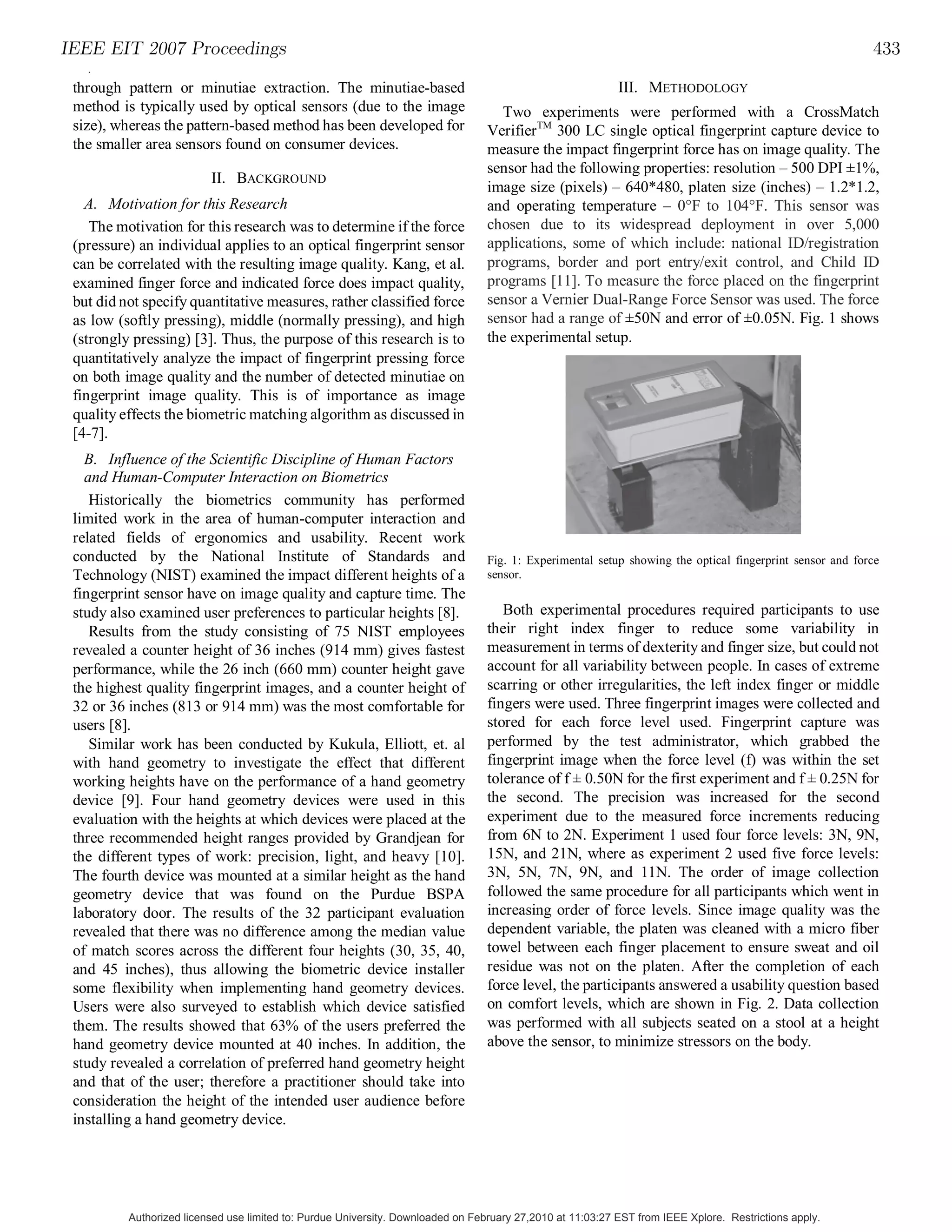 1) Two experiments were conducted to evaluate the impact of fingerprint force levels on image quality and number of detected minutiae. Force levels between 3-21 Newtons were tested using an optical fingerprint sensor.