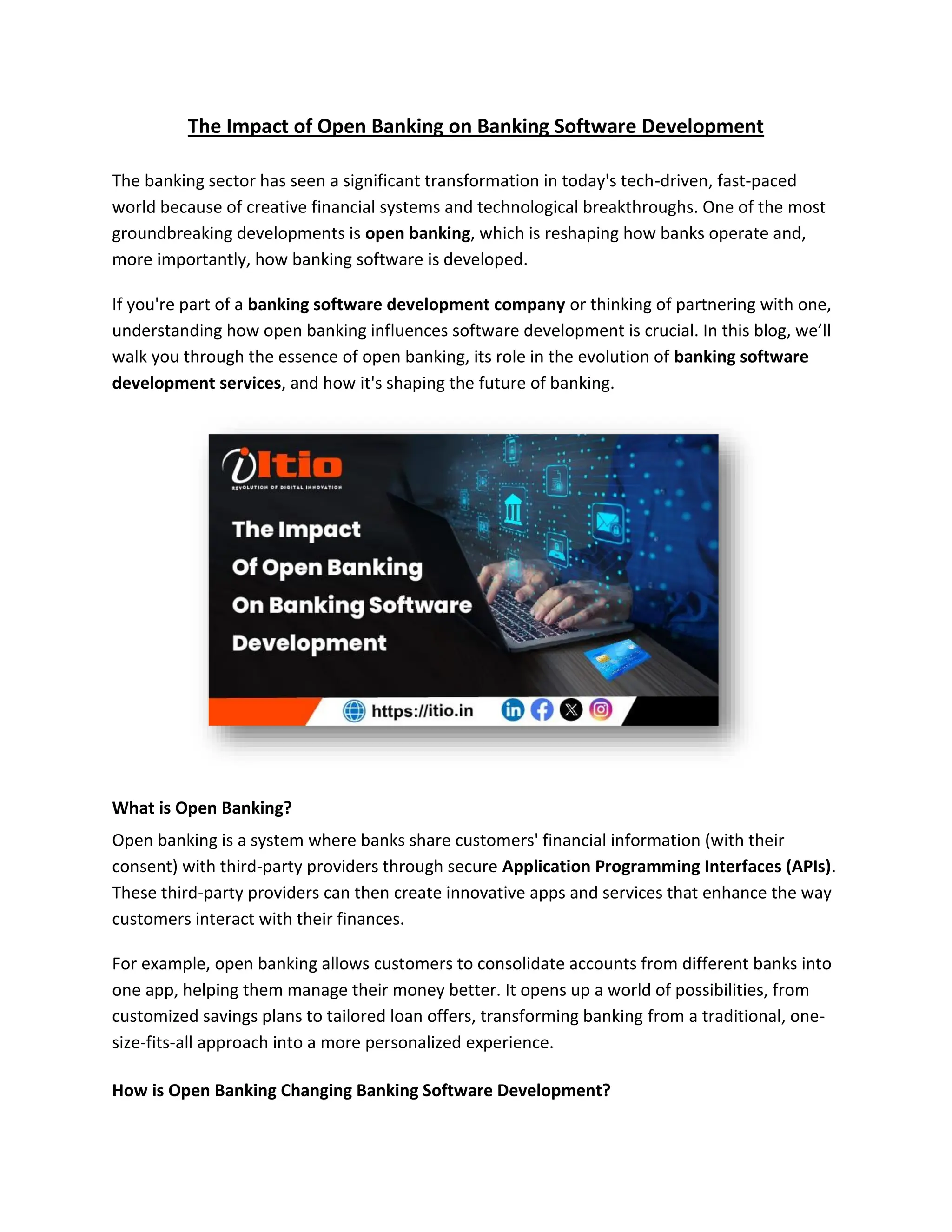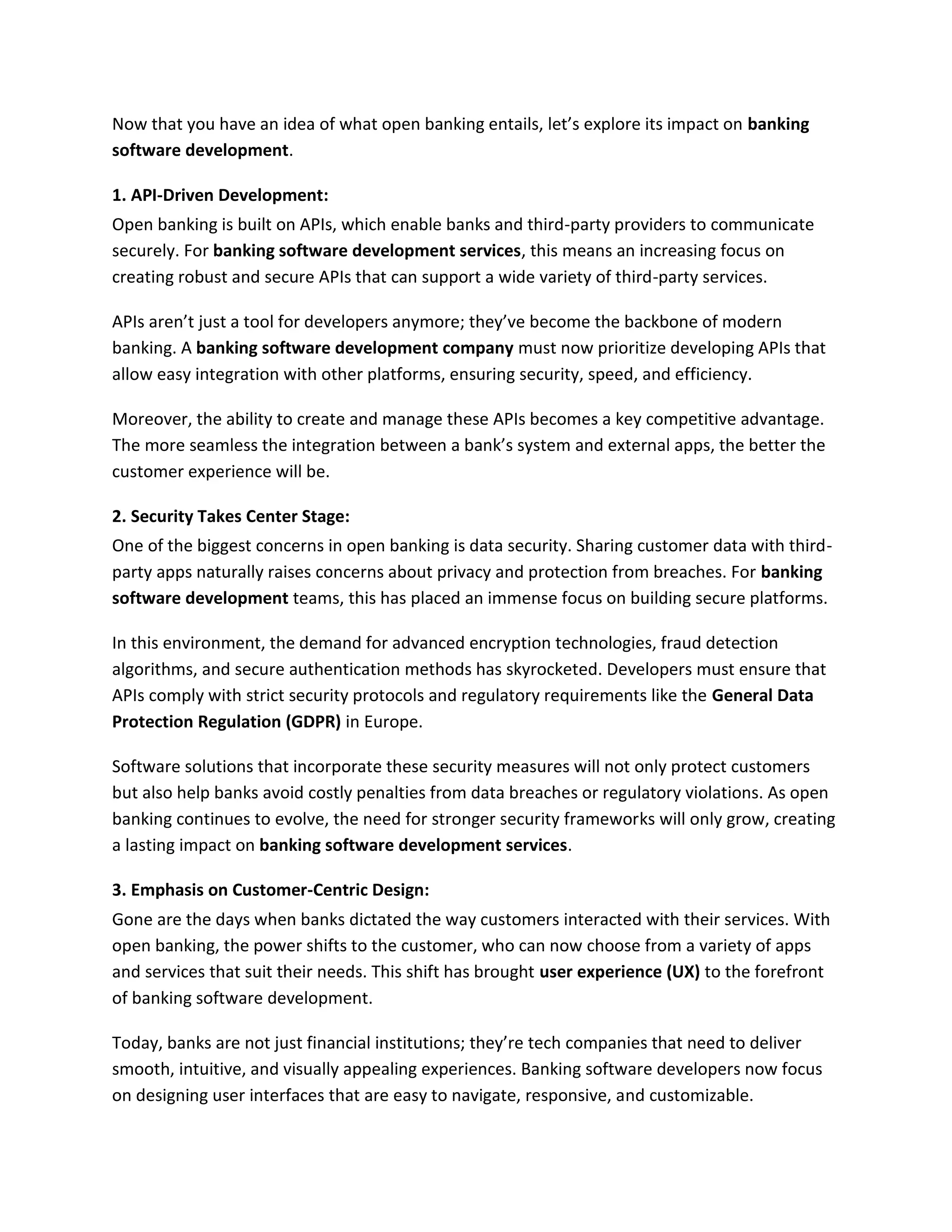 Open banking is transforming the banking sector by allowing banks to share customer financial data with third-party providers, enhancing customer experience through innovative apps and services. This shift emphasizes API-driven development, data security, customer-centric design, data analytics, and agile collaboration in banking software development. As banks embrace open banking, the demand for secure, efficient, and user-friendly financial solutions continues to grow.