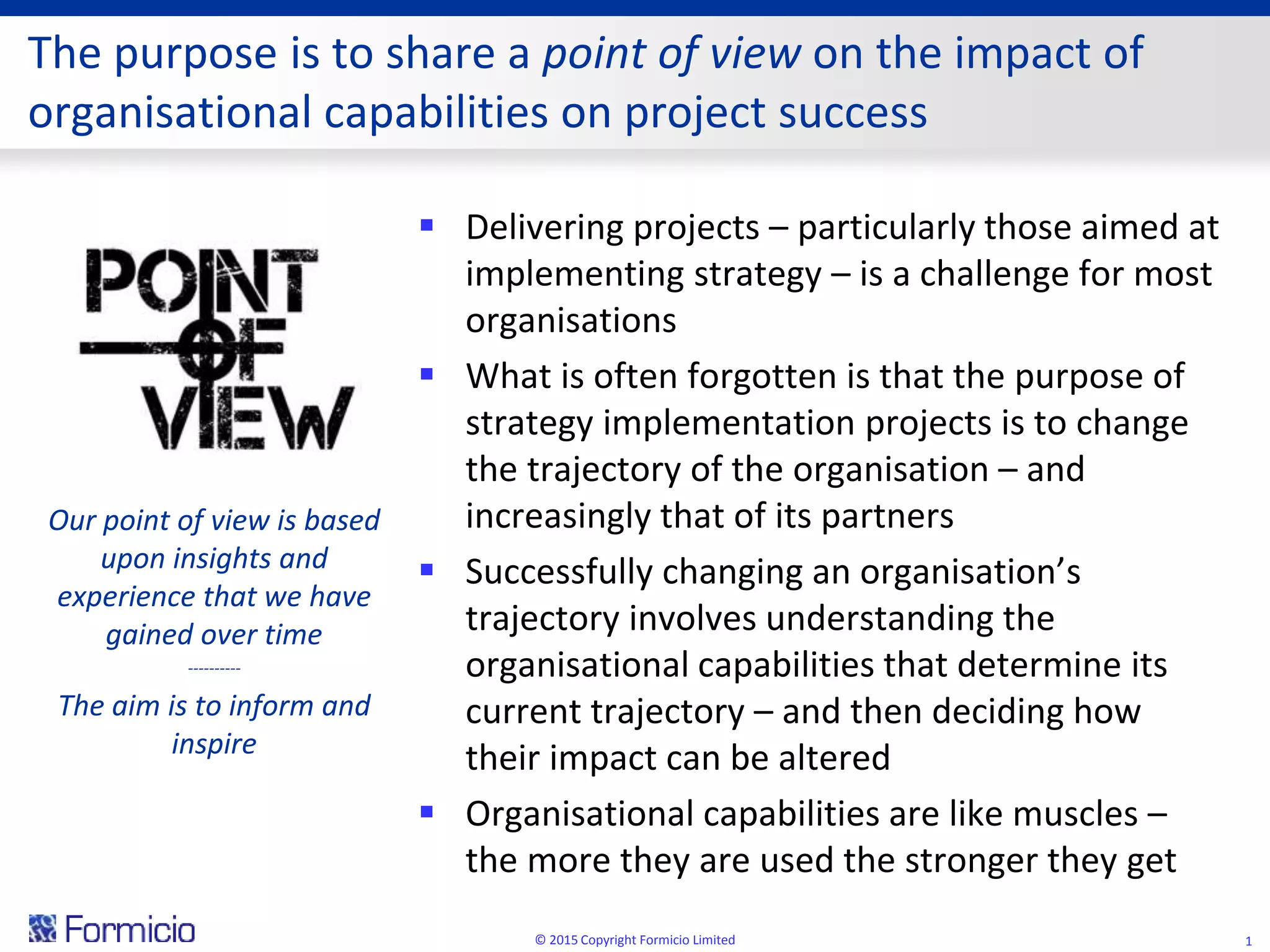 The document discusses the critical role of organisational capabilities in determining project success and an organisation's trajectory. It highlights that many projects fail due to misalignment with existing capabilities, suggesting that capabilities must be strengthened, introduced, or weakened to achieve desired changes. The text emphasizes the importance of assessing these capabilities through reflective questioning to ensure successful strategy implementation.