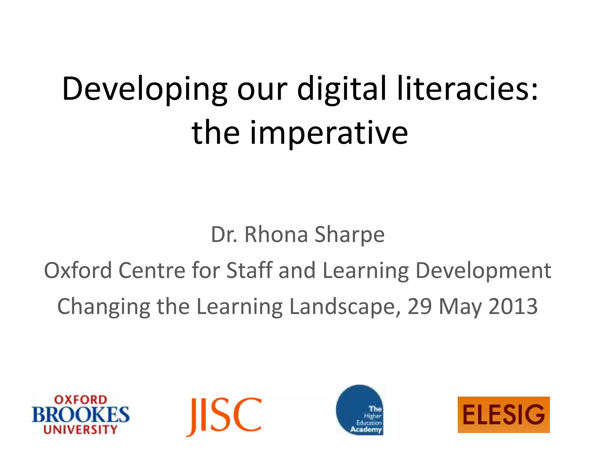 The document discusses the concept of digital literacy, emphasizing its broader definition beyond mechanical skills to include socially and culturally situated practices. It explores how individuals develop their digital literacies, the importance of being digitally literate in educational environments, and the need for educators to lead in cultivating these skills. The document highlights the necessity for confidence and agility in adapting to the digital age and the role of context in shaping digital literacy practices.