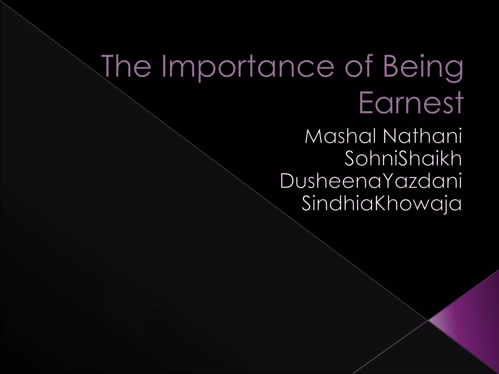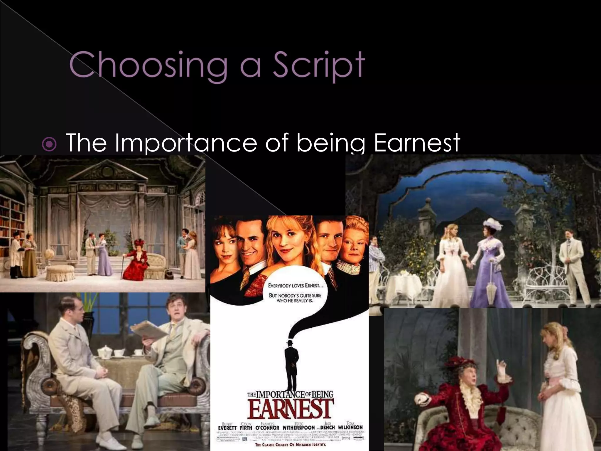 This document provides details for designing and producing a theatrical adaptation of Oscar Wilde's play "The Importance of Being Earnest". It discusses the plot, themes, characters, settings, costumes, lighting, and other production elements. The play is a satire of Victorian era social norms and values, using humor and farce. Production elements like the set design, costumes, and lighting should reflect the time period while enhancing the themes of deception and maintaining social appearances over truth and sincerity.