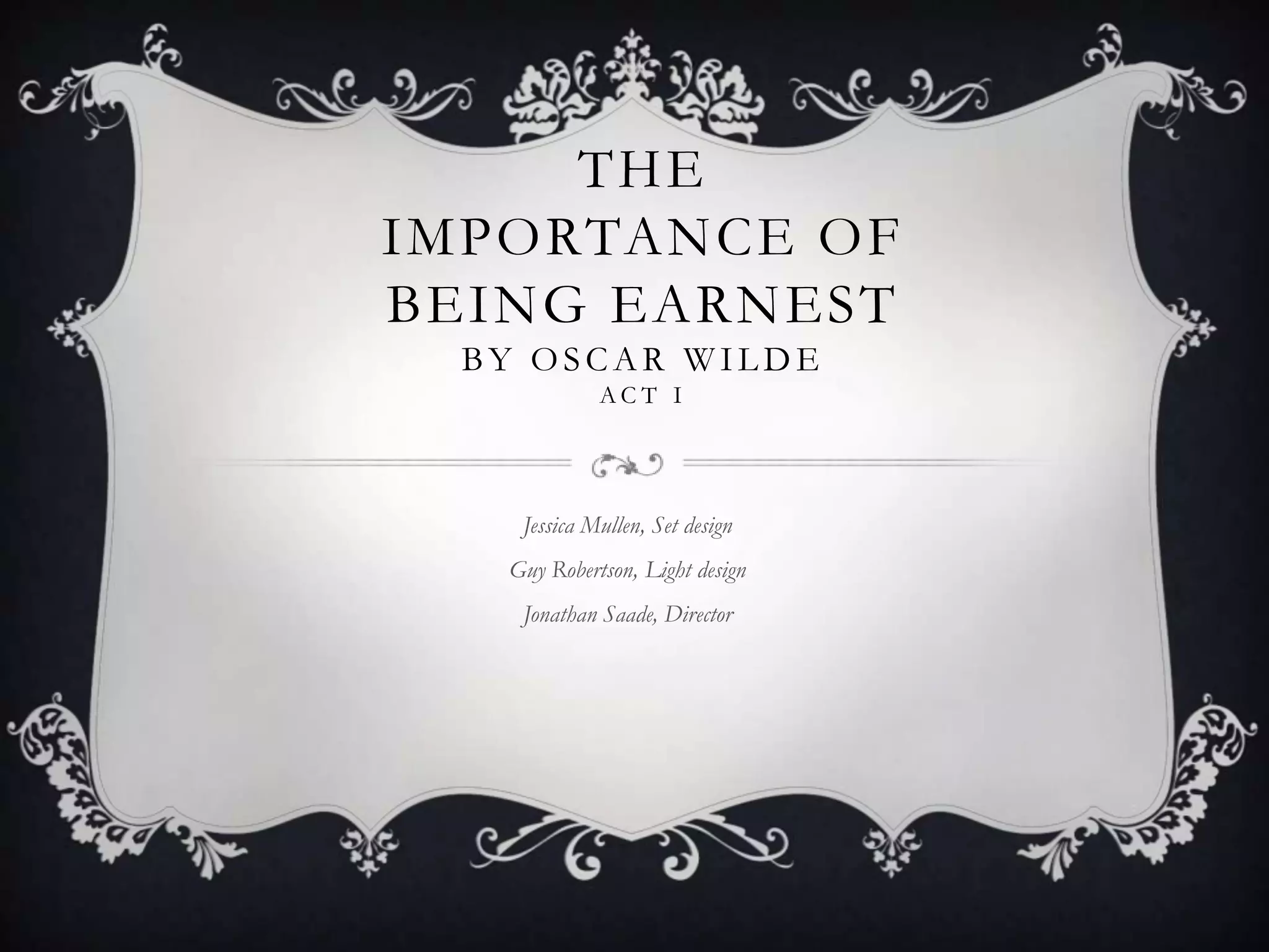 This document provides information about the production of Oscar Wilde's play "The Importance of Being Earnest". It includes sections on the set design by Jessica Mullen, which aims to establish the late 1800s London setting of a luxurious flat. It also covers the light design by Guy Robertson, which will use various lighting techniques to set the mood and enhance visibility on stage. Finally, it discusses the directorial concept by Jonathan Saade, who plans to portray the play's themes of secret double lives and superficial Victorian society using a realistic style reflective of the elite social class.