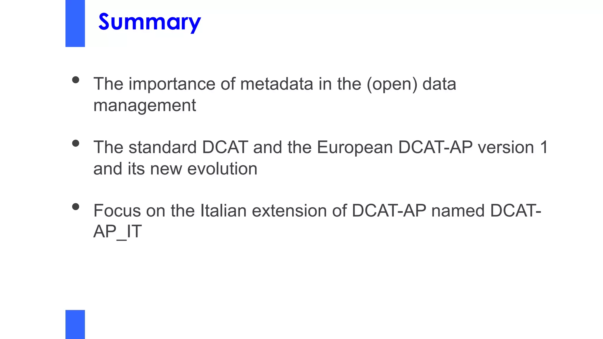 2. DCAT-AP_IT is the Italian implementation of DCAT-AP, which extends it with additional mandatory properties and controlled vocabularies. It defines core classes and properties for catalogs, datasets, and distributions in RDF.