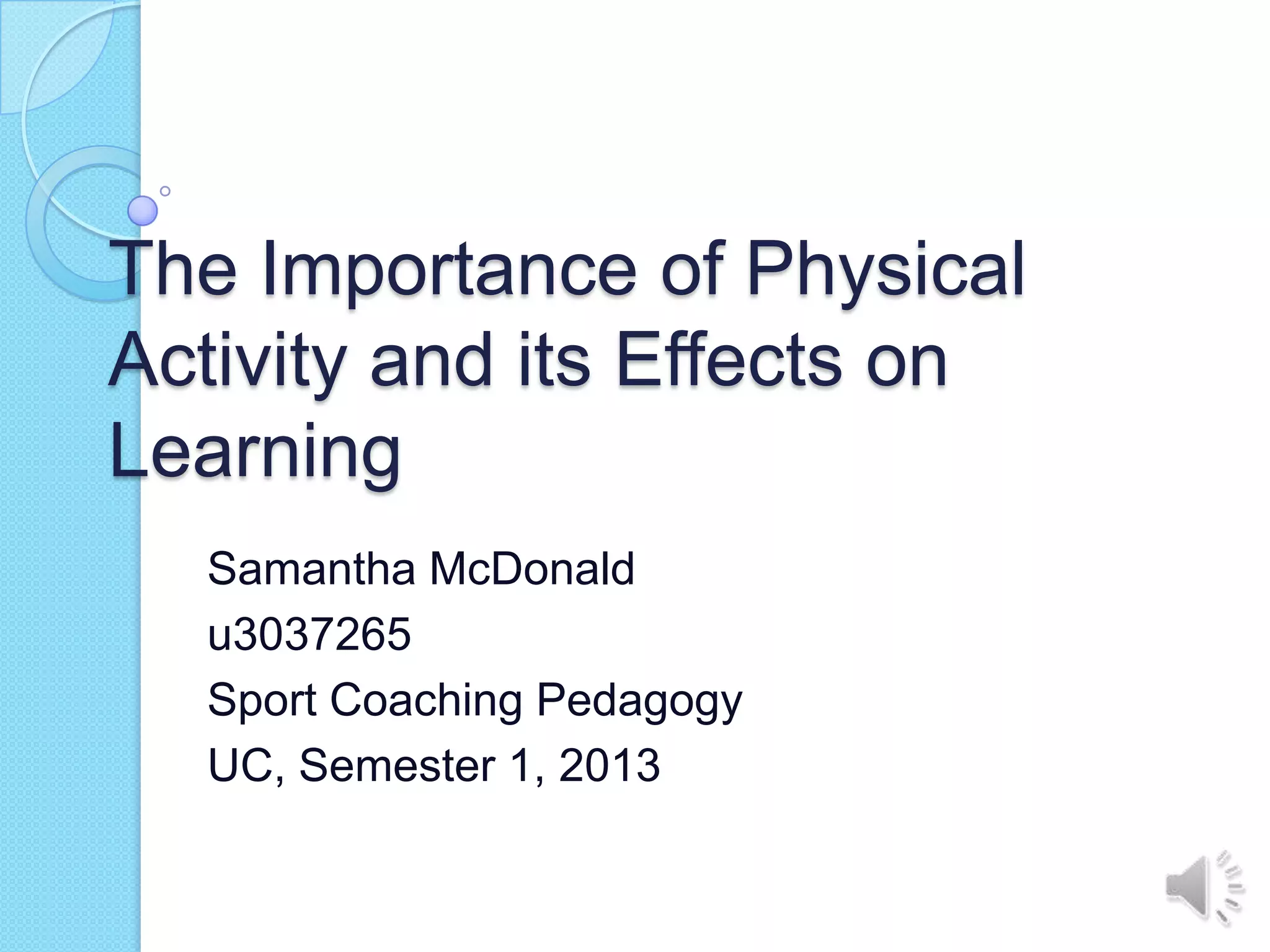 The document discusses the significance of physical activity for children, highlighting its relationship with health, academic performance, and barriers to participation. It emphasizes that physical inactivity is a major global health risk, with recommendations for at least 60 minutes of daily activity and reduced screen time. Additionally, it presents evidence suggesting that incorporating physical activity in educational settings can enhance students' academic outcomes and overall well-being.