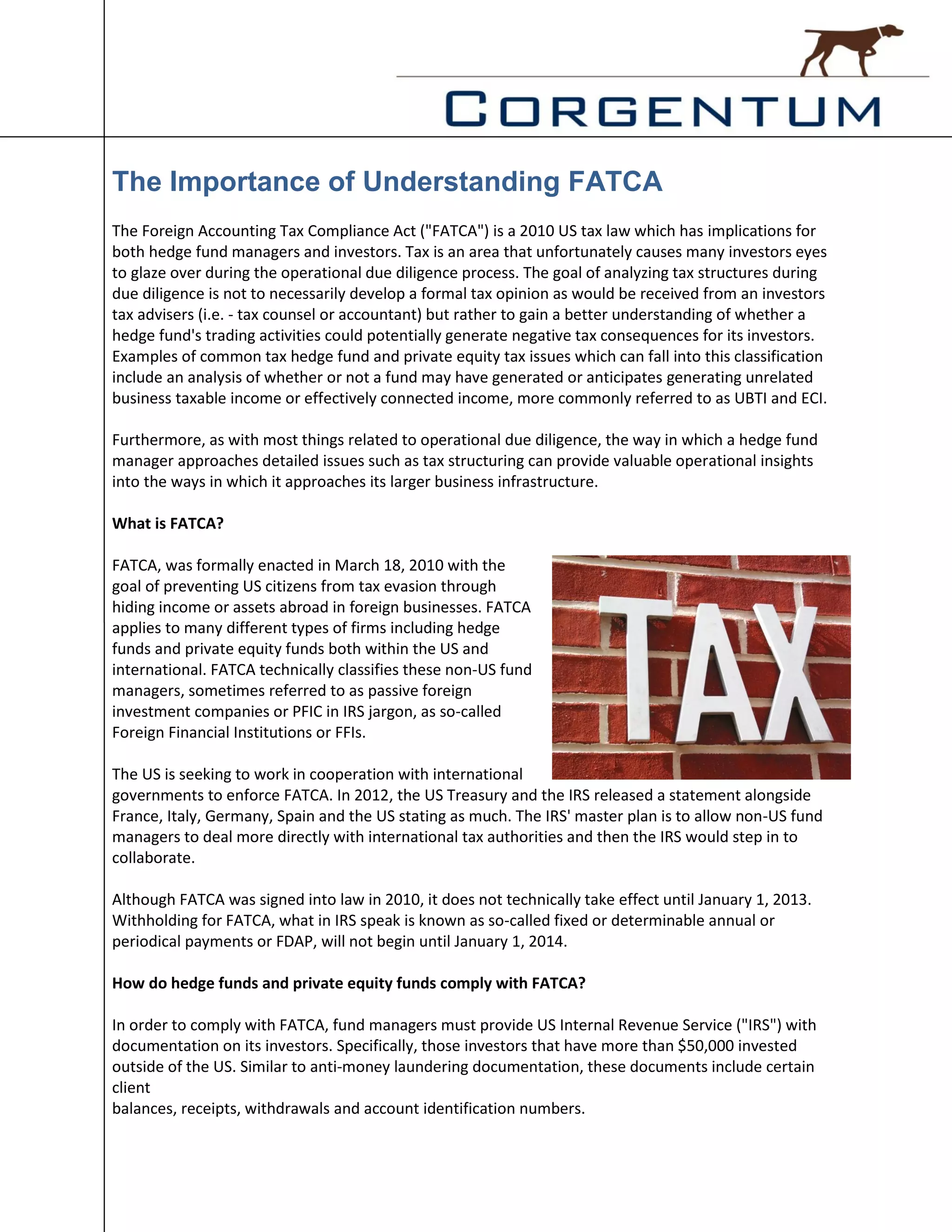 The document discusses the significance of understanding the Foreign Account Tax Compliance Act (FATCA), a U.S. tax law enacted in 2010 that affects hedge fund managers and investors by requiring compliance to prevent tax evasion. It outlines the implications of FATCA for fund managers, including the need to document investor information and the penalties for non-compliance, such as a 30% withholding tax on U.S. assets. Investors are advised to engage with their fund managers on their FATCA compliance plans to mitigate potential risks and liabilities.