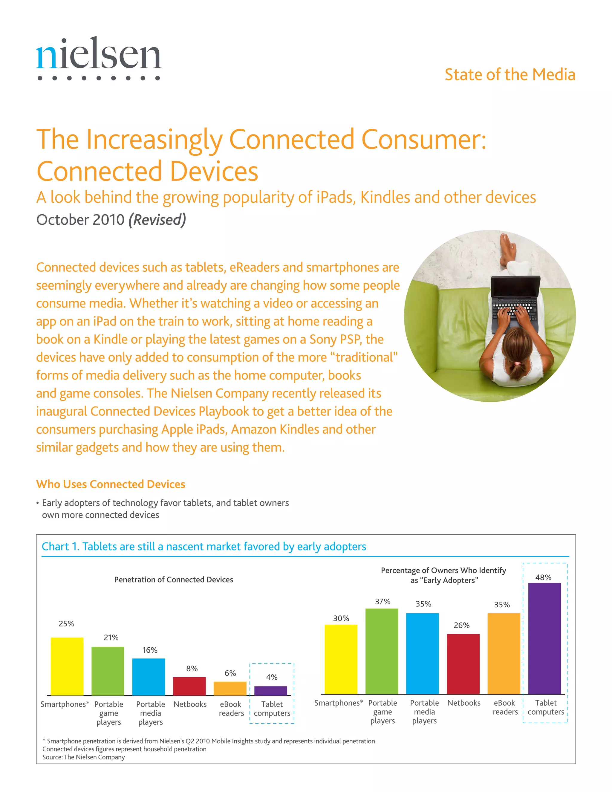 The document discusses the rise of connected devices like tablets, e-readers, and smartphones, highlighting their impact on media consumption patterns. It reveals that tablet users are typically younger, predominantly male, and more likely to share their devices compared to smartphone and e-reader users. Additionally, it emphasizes the preference for tablets for media engagement, with iPad users being more receptive to advertising and likely to make purchases after viewing ads.