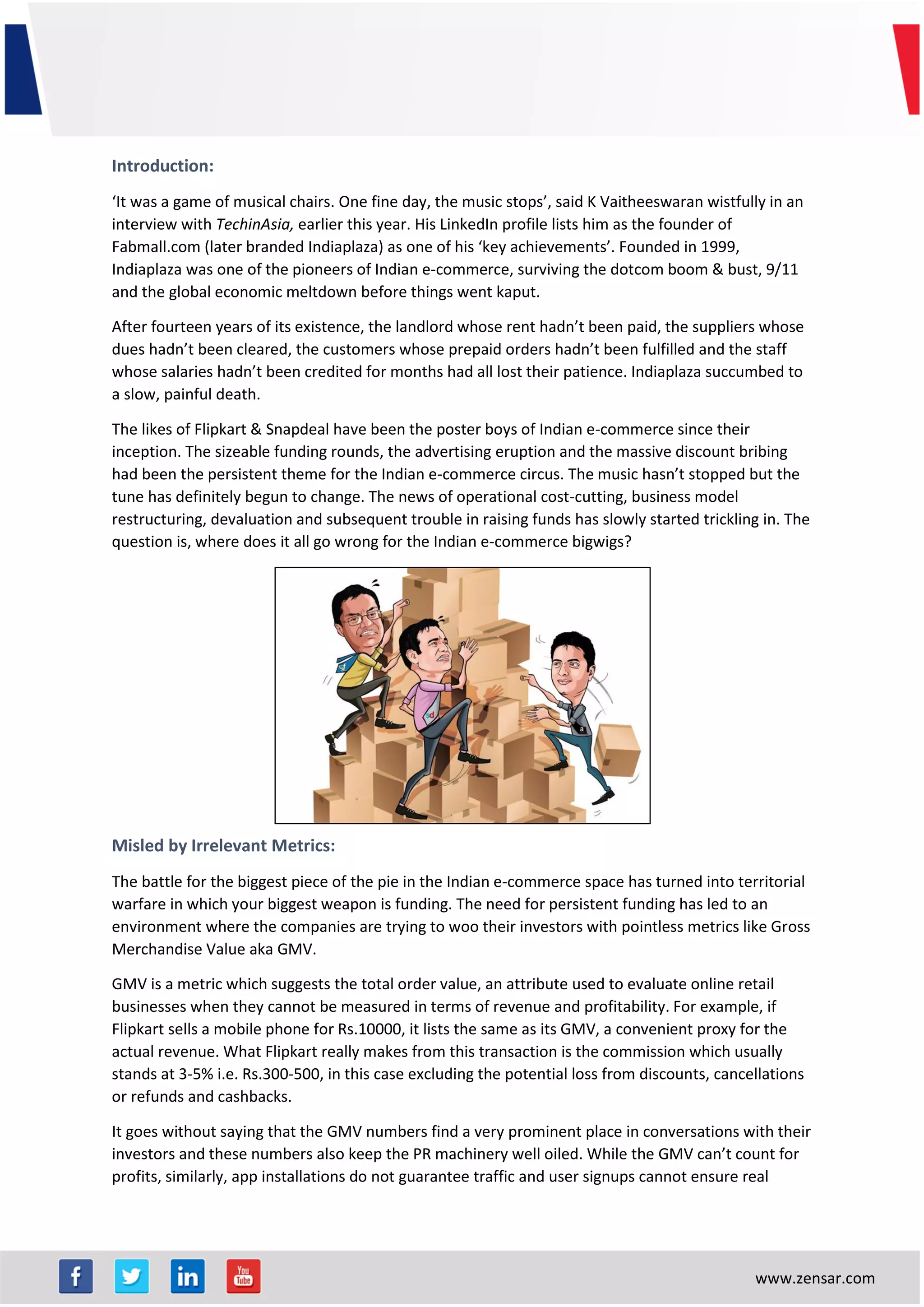 The Indian e-commerce sector is facing challenges due to misplaced priorities of companies. Companies focused on increasing gross merchandise value and funding rounds rather than profitability. This led them to spend heavily on discounts, inventories, and warehouses while ignoring customer retention. While startups like Amazon focused on logistics and customer experience, others replicated the US model without understanding Indian customer preferences. For e-commerce to succeed in India, companies need to focus on minimizing costs, understanding local customer dynamics, and increasing customer loyalty through retention strategies rather than promotional discounts.