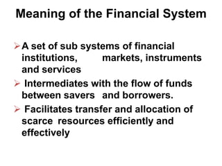 The document provides an overview of the Indian financial system. It discusses that the Indian financial system comprises formal (organized) and informal (unorganized) sectors. The formal sector is regulated and includes various financial institutions, markets, instruments and services. It also discusses the evolution of the Indian financial system from the pre-1951 era dominated by money lenders and traders, to the post-1951 period which saw the development of public sector banks and institutions, and later privatization and globalization in the financial system from the early 1990s onward. Key components of the formal financial system like regulators, financial institutions, markets, instruments and services are also explained.