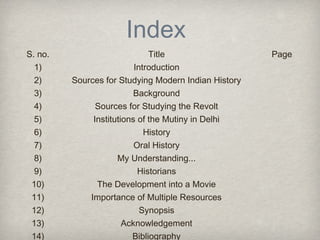 This document provides an overview of sources that can be used to study the Indian Mutiny of 1857. It discusses literary sources like books, newspapers, letters, and documents as well as archaeological sources like buildings, monuments, tools, and paintings. Specifically, it examines sources related to key sites of the mutiny, including the Red Fort and Northern Ridge in Delhi. It also includes an excerpt from a book describing the brutal suppression of the mutiny by British forces. The document aims to outline different types of primary sources that can help provide insight into this major historical event in India.