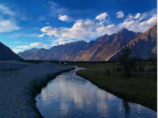 The document discusses several major rivers within the Indus River System located in India and Pakistan. It mentions the Indus River originates in Tibet near Lake Manasarowar and flows through India's Ladakh region before entering Pakistan. It also discusses tributaries like the Shyok River and Nubra River which feed into the Indus. Other key tributaries mentioned include the Jhelum, Chenab, Ravi, Beas, and Sutlej rivers.