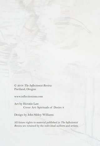 This document summarizes an issue of The Inflectionist Review, a small press publishing contemporary poetry. It provides information on the mission, editors, featured artist, and various poems included in the issue. The editors' introduction discusses using language to foster understanding between people from different backgrounds and experiences. The issue features poems from over 20 contributors and artwork from featured artist Horatio Law exploring spiritual themes.