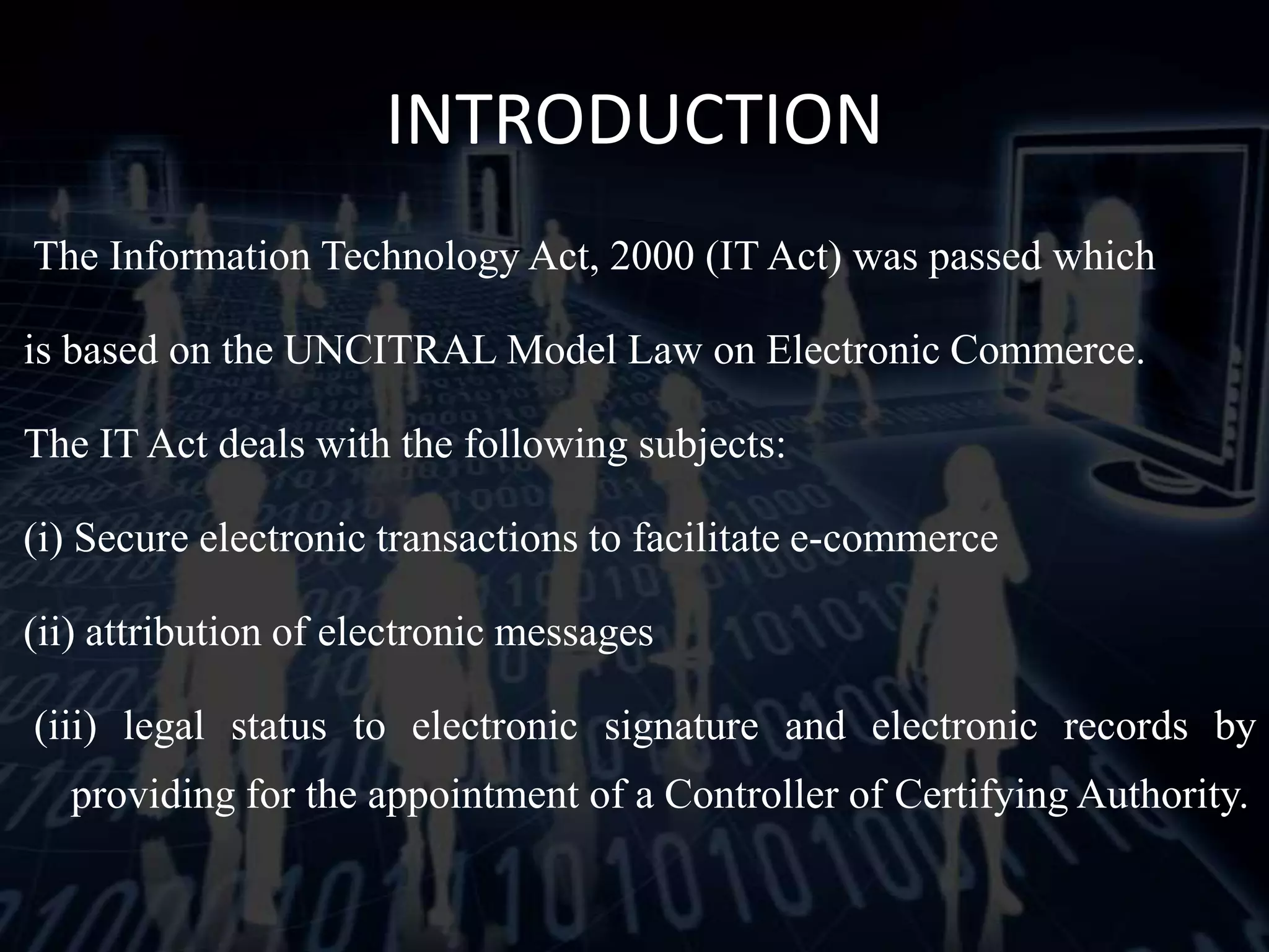 The Information Technology Act, 2000 provides the legal framework for electronic governance in India. Some key points covered in the act include: