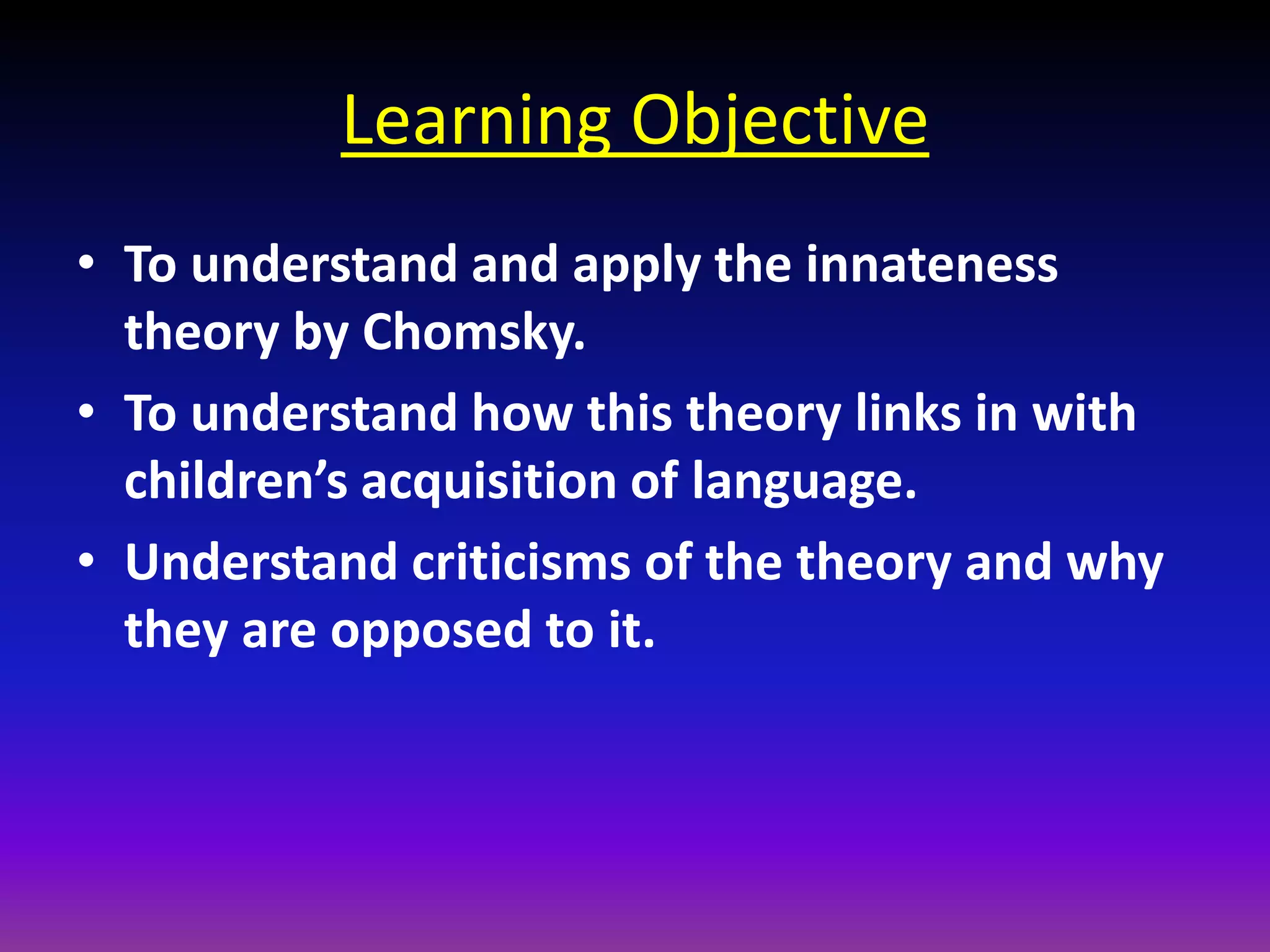 This document discusses Noam Chomsky's innateness theory of language acquisition. The key points are:
