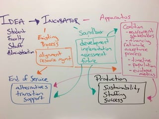 The document outlines a structured approach to academic innovation, detailing six key steps: idea generation, incubation, development, implementation, assessment, and future iterations. It emphasizes the importance of collaboration among stakeholders and the need for flexibility in defining innovation. The framework encourages innovative thinking while adhering to academic rigor, ultimately aiming for effective and efficient outcomes within the academic community.