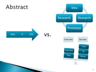 The document discusses the challenges of innovation and product commercialization, highlighting high failure rates for new products, especially in startups. It introduces a 'Quicklook' process designed to assess and evaluate market opportunities and technology viability through structured research and customer engagement. Additionally, it outlines the development of a new dry vaccine technology aimed at improving immunization coverage in resource-limited settings.