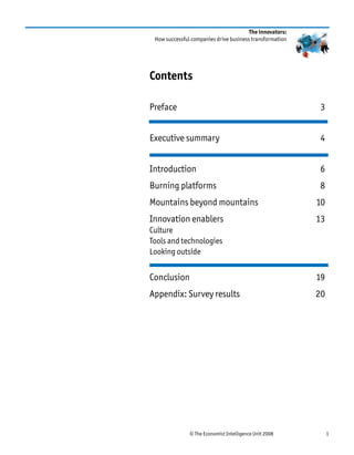 The document discusses challenges that companies face with innovation. While generating new ideas is difficult, most companies find that bringing ideas to implementation is even more challenging. Common barriers to implementation include resistance to change, shifting priorities, and lack of project ownership. However, some companies are more successful at innovation than others by making it a top priority, especially when facing competitive threats or market changes. These "leaders" focus their innovation efforts on customer-facing areas like new product development, marketing, and customer service.