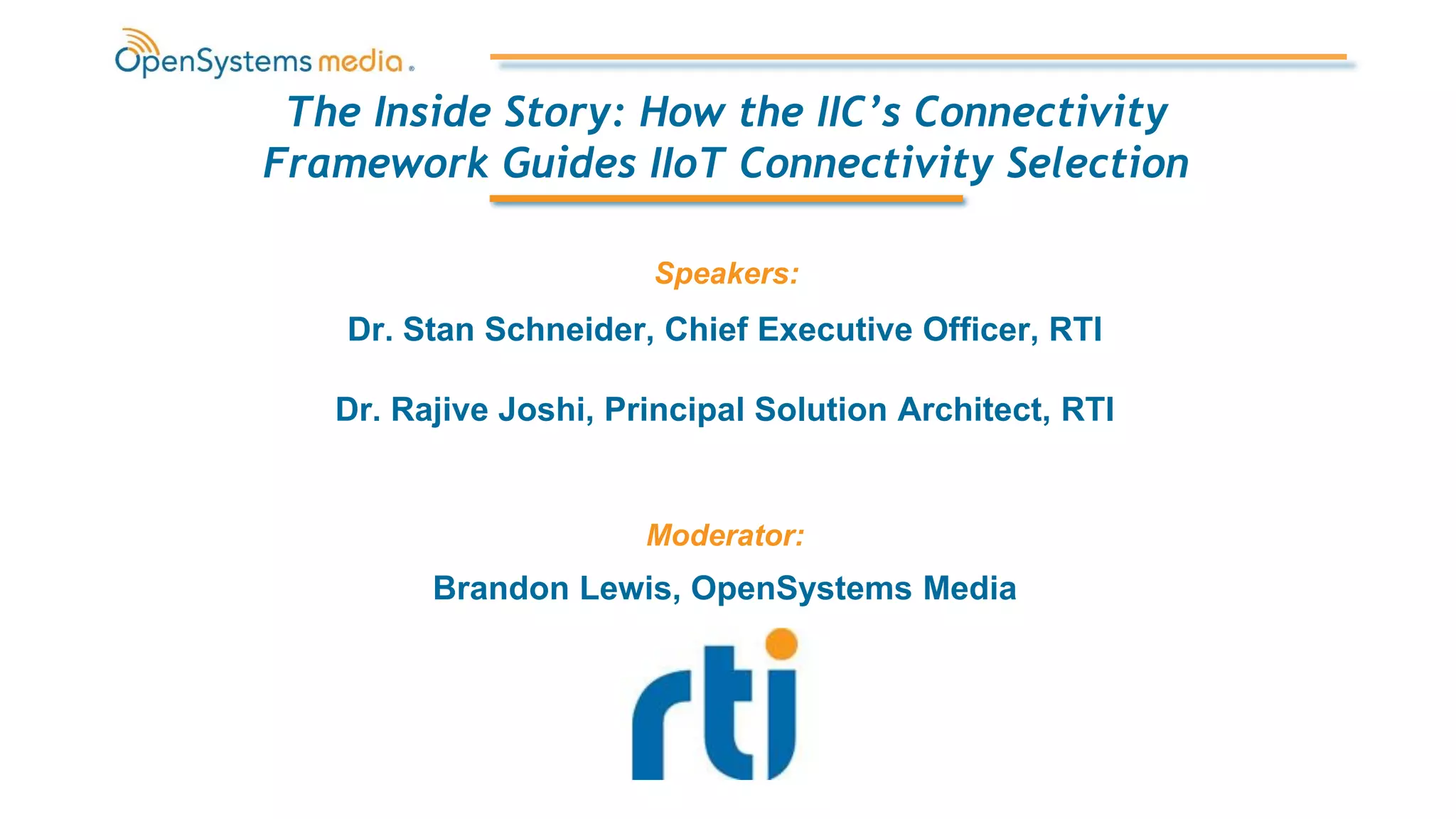 The document discusses a presentation given by Dr. Stan Schneider, CEO of RTI, and Dr. Rajive Joshi, Principal Solution Architect at RTI, on how the Industrial Internet Consortium's (IIC) Connectivity Framework guides selection of connectivity technologies for industrial internet of things (IIoT) systems. The presentation covered the goals of the IIC Connectivity Framework in providing guidance to practitioners on IIoT connectivity, the layers of the IIoT connectivity stack model, core connectivity standards, and a process for assessing and selecting the appropriate connectivity standard.