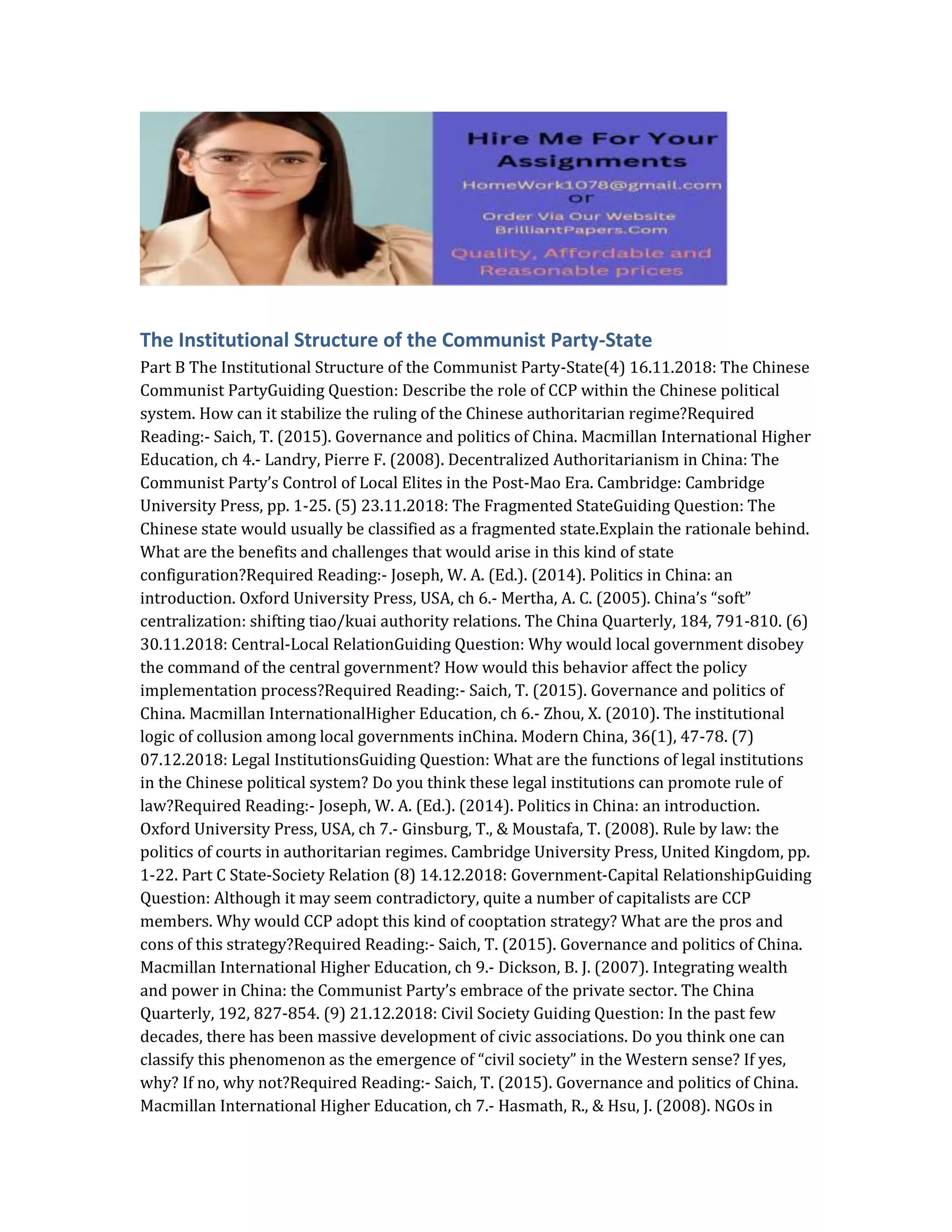 The document outlines the topics and required readings for a course on the institutional structure of the Chinese Communist Party-state. The course covers topics such as the role of the CCP in the political system and how it stabilizes authoritarian rule, the fragmented nature of the Chinese state and the benefits and challenges it poses, central-local relations and why local governments may disobey central commands, the functions of legal institutions and the prospects for rule of law in China, the relationship between the government and private sector capitalists, the emergence of civil society, and the possibility for social unrest and common protest tactics.