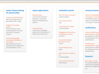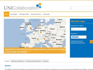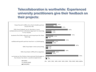The document discusses the Intent project, which aims to integrate telecollaborative networks in foreign language higher education to enhance language skills and intercultural competence among students. It highlights the importance of mobility in the European Higher Education Area and proposes virtual mobility as a valuable alternative for students unable to study abroad. Additionally, the project developed various resources, including surveys, a platform for collaboration, and recommendations for improving telecollaboration in universities.