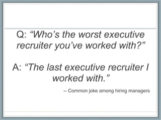The document introduces an executive recruiting firm called The InterMediator Group that aims to improve upon traditional executive recruiting approaches. The firm charges a set fee rather than a percentage of the candidate's compensation. It also uses validated assessment tools to better evaluate candidate fit and skills. The firm handles no more than three assignments at a time to provide quality service and is responsive to both clients and candidates.