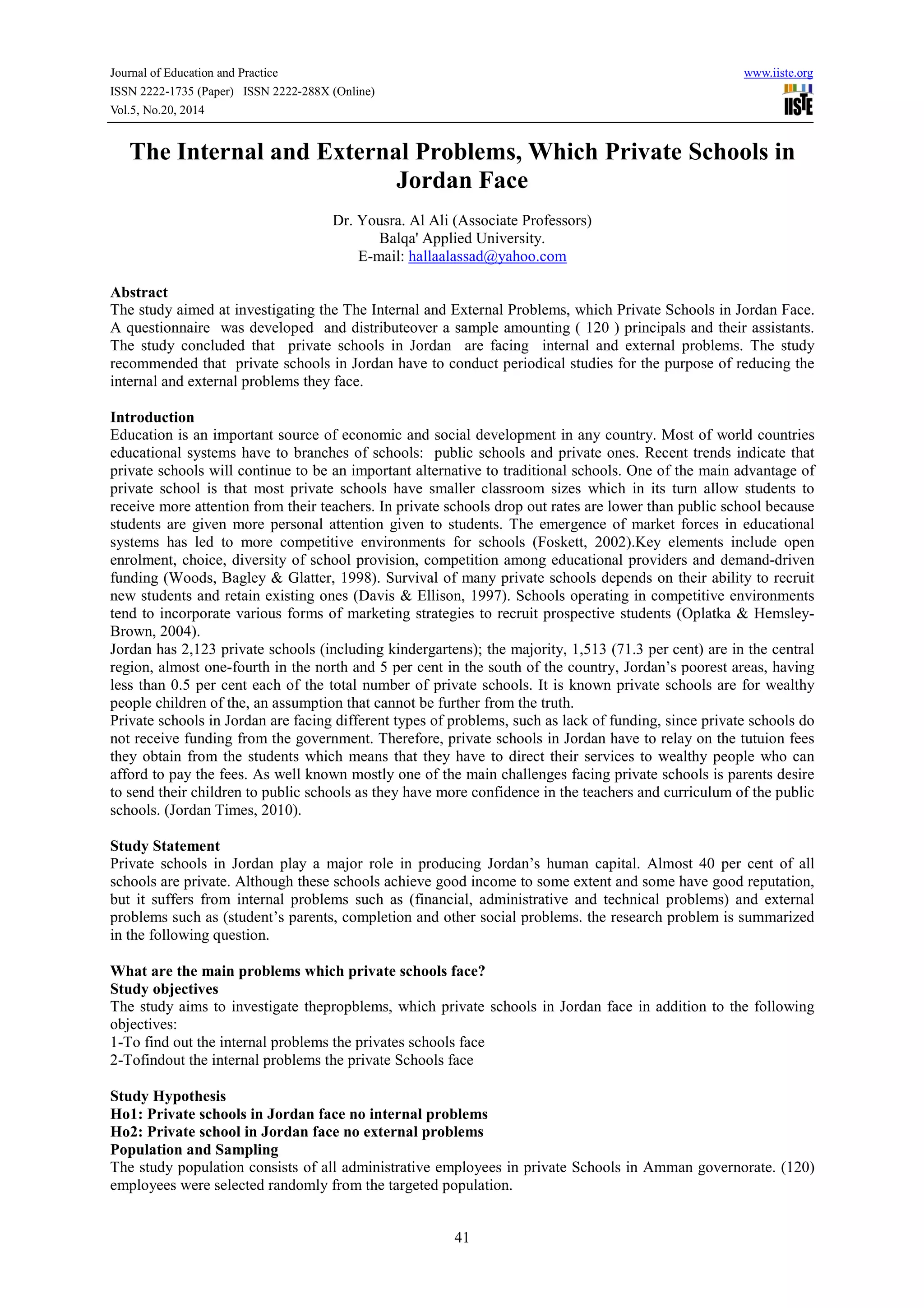 The study investigates the internal and external challenges faced by private schools in Jordan, surveying 120 principals and their assistants. Key findings reveal significant internal issues, particularly financial problems and teacher turnover, alongside external pressures such as parental interference and weak relations with school administration. The study emphasizes the need for continuous research to mitigate these challenges.
