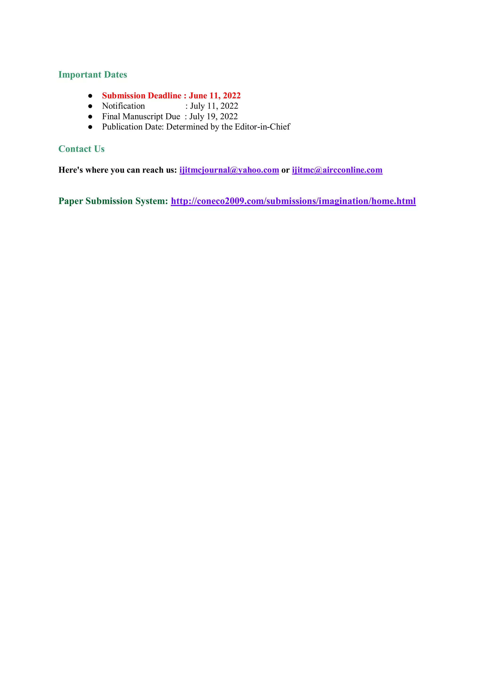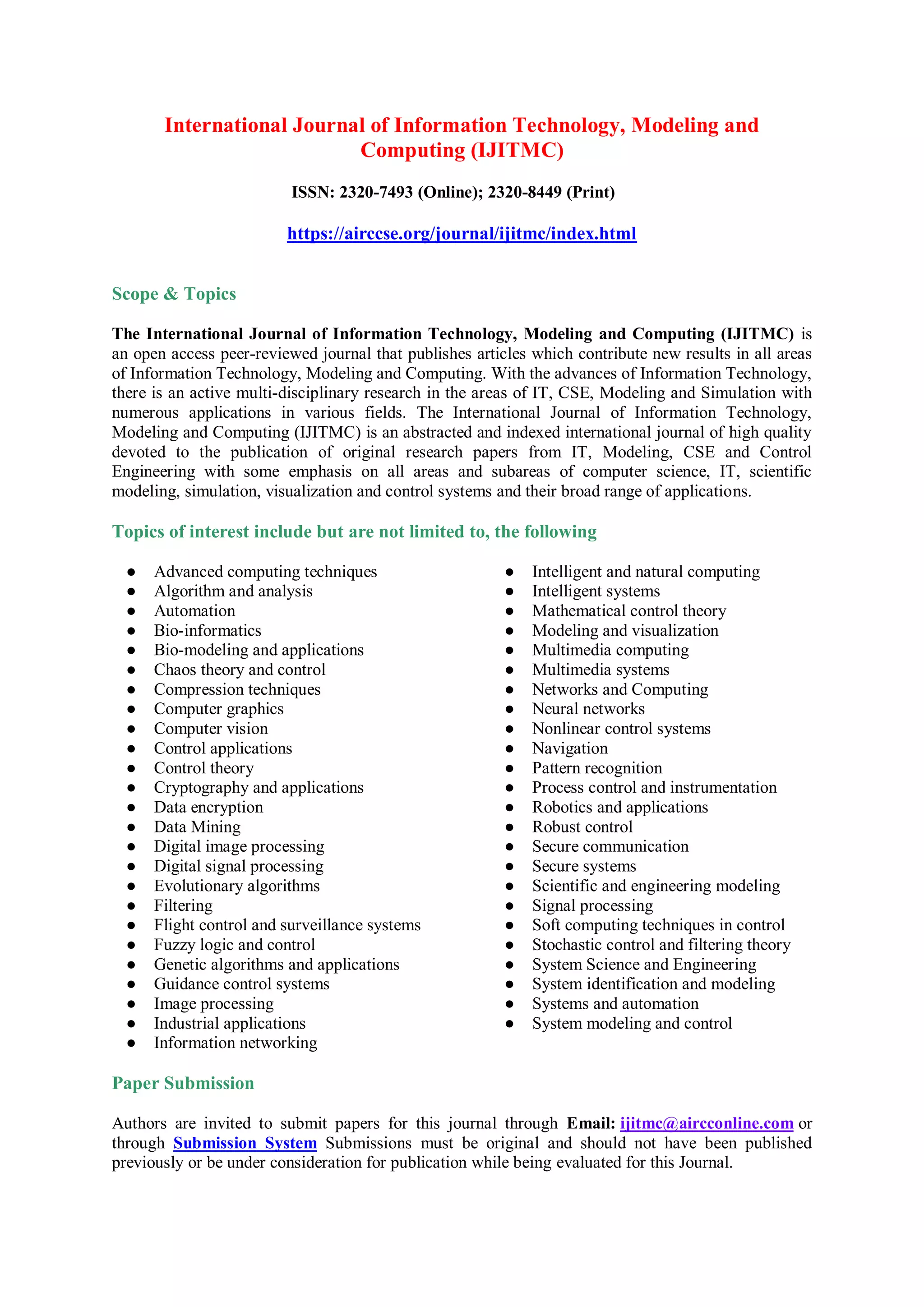 The International Journal of Information Technology, Modeling and Computing (IJITMC) is a peer-reviewed, open-access journal that publishes original research articles in various fields of IT, modeling, and computing. Topics of interest include advanced computing techniques, data mining, computer vision, and robotics, among others. Authors can submit papers via email or an online submission system, with important deadlines outlined for submission and publication.