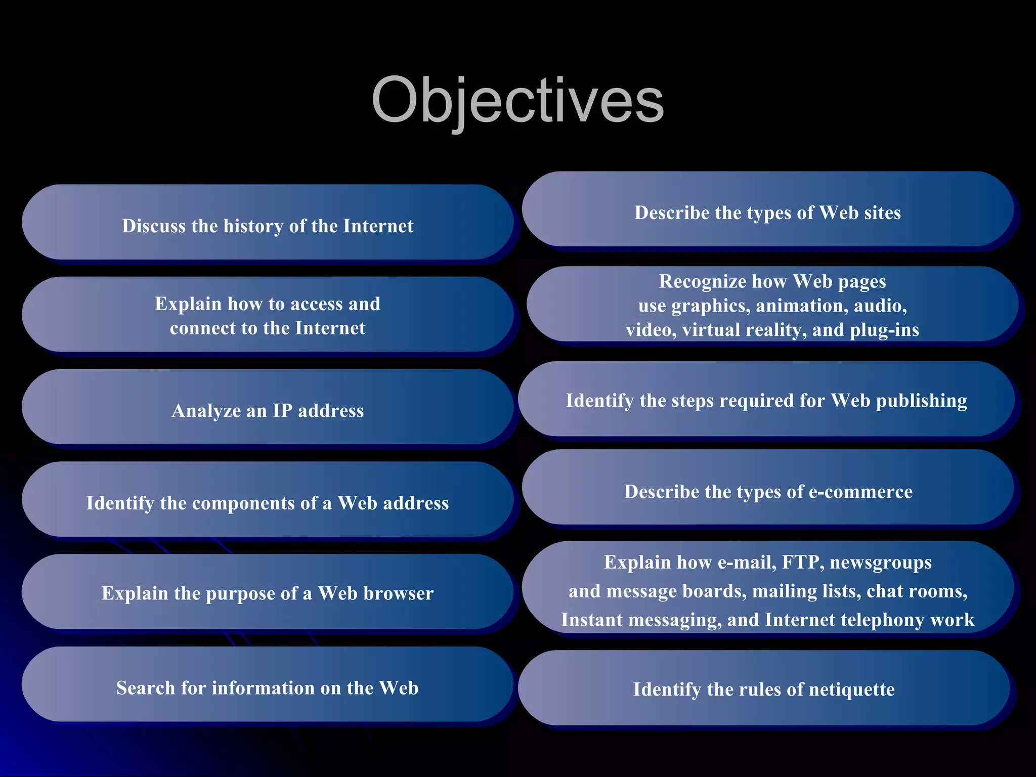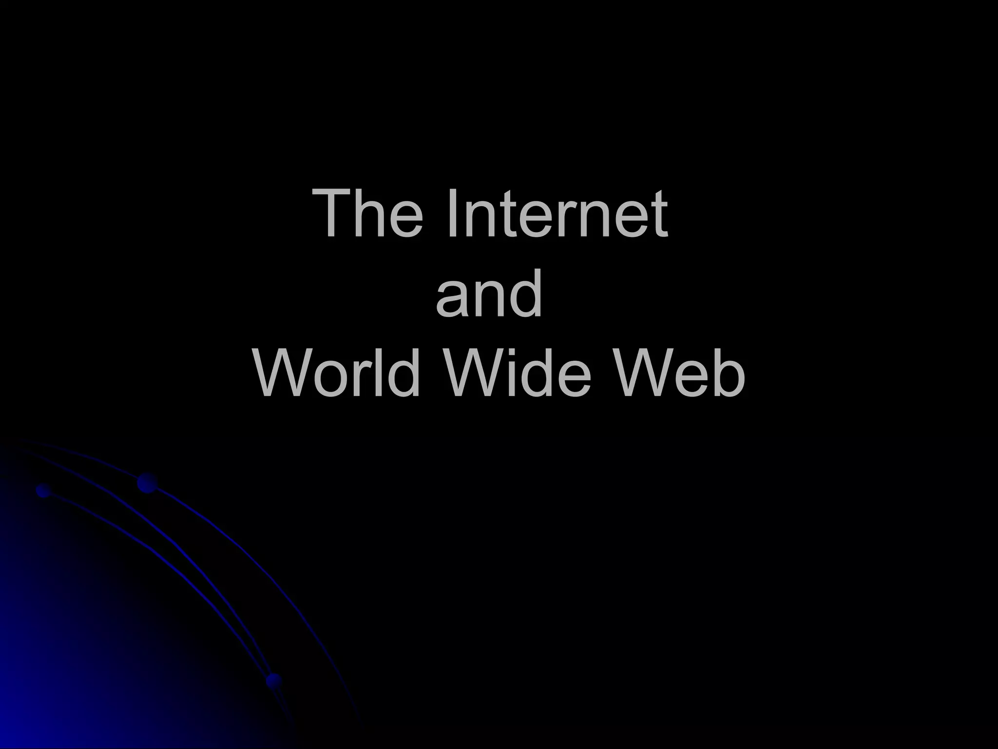 The document discusses the history and services of the Internet and World Wide Web. It begins with the origins of the ARPANET network project in 1969 and how it evolved into the Internet we know today. It then explains the development of the World Wide Web and how users can access and navigate it using web browsers, search engines, links and other features. The document also outlines various internet services like email, forums, chat rooms and e-commerce as well as best practices for online etiquette.