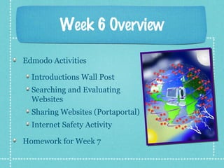 This document provides an overview of the activities and assignments for Week 6 of an instructional technology course. Students will use the social networking site Edmodo to introduce themselves, search and evaluate websites, and share websites using PortaPortal. They will also complete an internet safety activity evaluating resources from NetSmartz. The homework for Week 7 includes reading a chapter, studying for a guide or answering focus questions, writing a journal reflection, creating a blog post, and watching videos for the next class.
