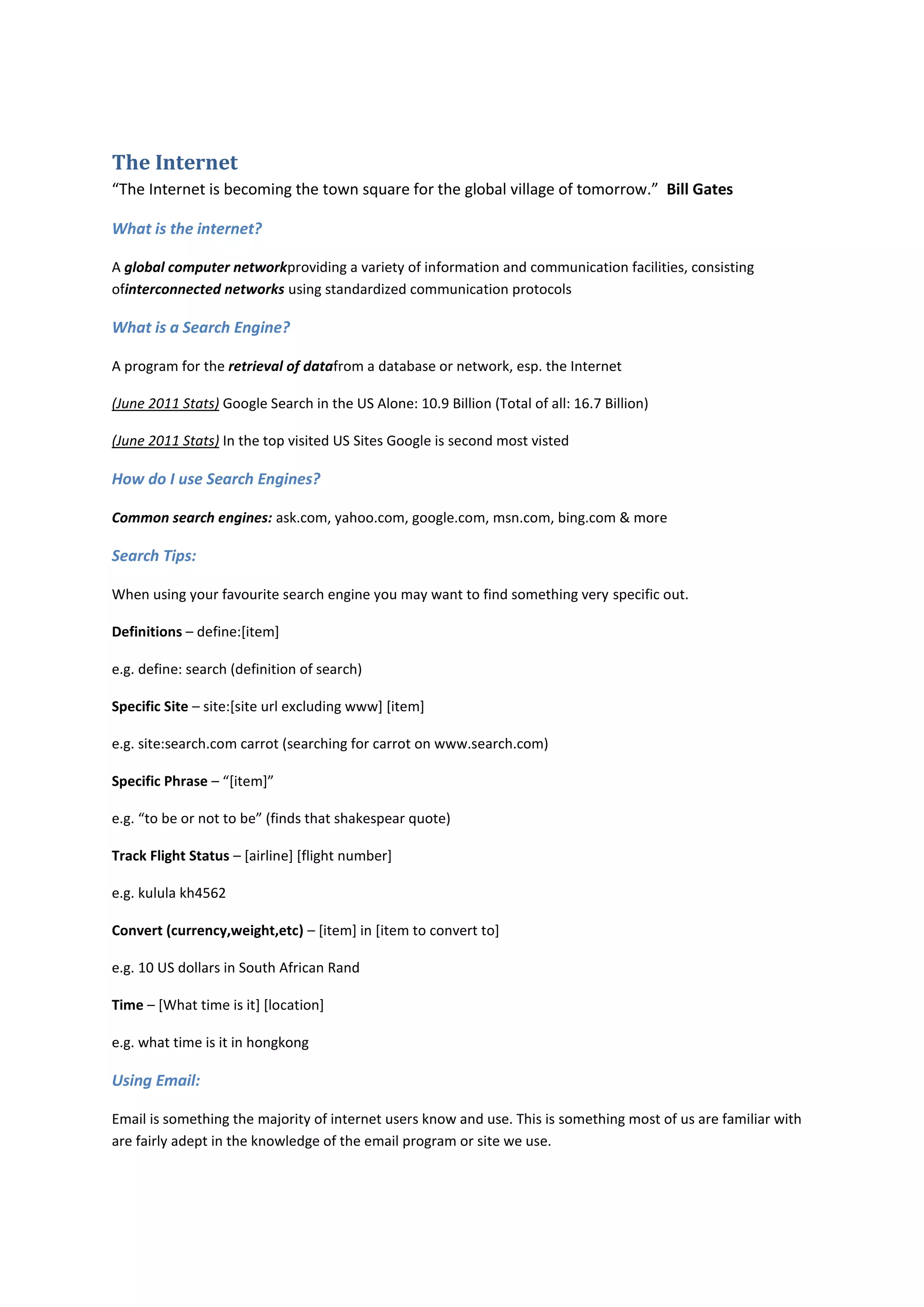 The Internet allows for global communication and access to information. Search engines like Google are commonly used to find information on the Internet. Users can search specific sites, phrases, or convert measurements. Email and social networks allow people to communicate online, while forums and blogs are spaces for discussion and self-expression. Newsfeeds aggregate information on topics people choose to follow across devices.