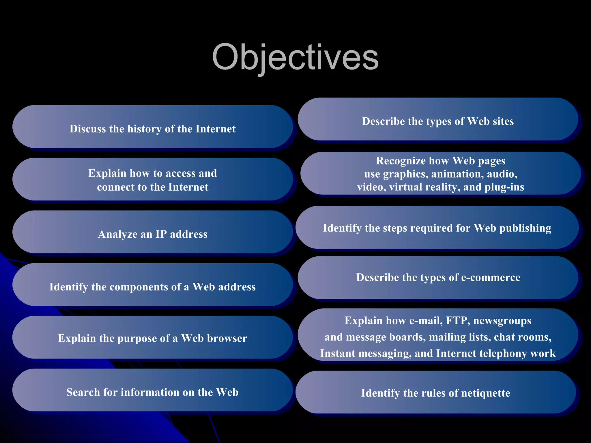 The document discusses various aspects of the Internet and World Wide Web. It begins with a brief history, describing the origins of the Internet as a US military networking project and its subsequent growth. It then covers topics like how to connect to the Internet, the development and functions of the World Wide Web, e-mail, and other online communication tools. The document provides definitions and explanations of key terms to build understanding of the capabilities and services available on the Internet.
