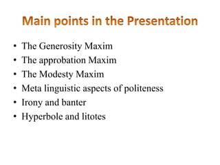 This document provides an overview of politeness maxims and principles discussed in Chapter 6 of a textbook on interpersonal rhetoric. It outlines several key maxims, such as the tact maxim to minimize cost and maximize benefit to others, the generosity maxim to minimize benefits to self and maximize costs to self, and the modesty maxim to minimize praise of self and maximize dispraise of self. It also discusses principles like the banter principle, irony, hyperbole, litotes, and the interest principle in conversations. Examples are provided to illustrate how these maxims and principles relate to politeness in language use.