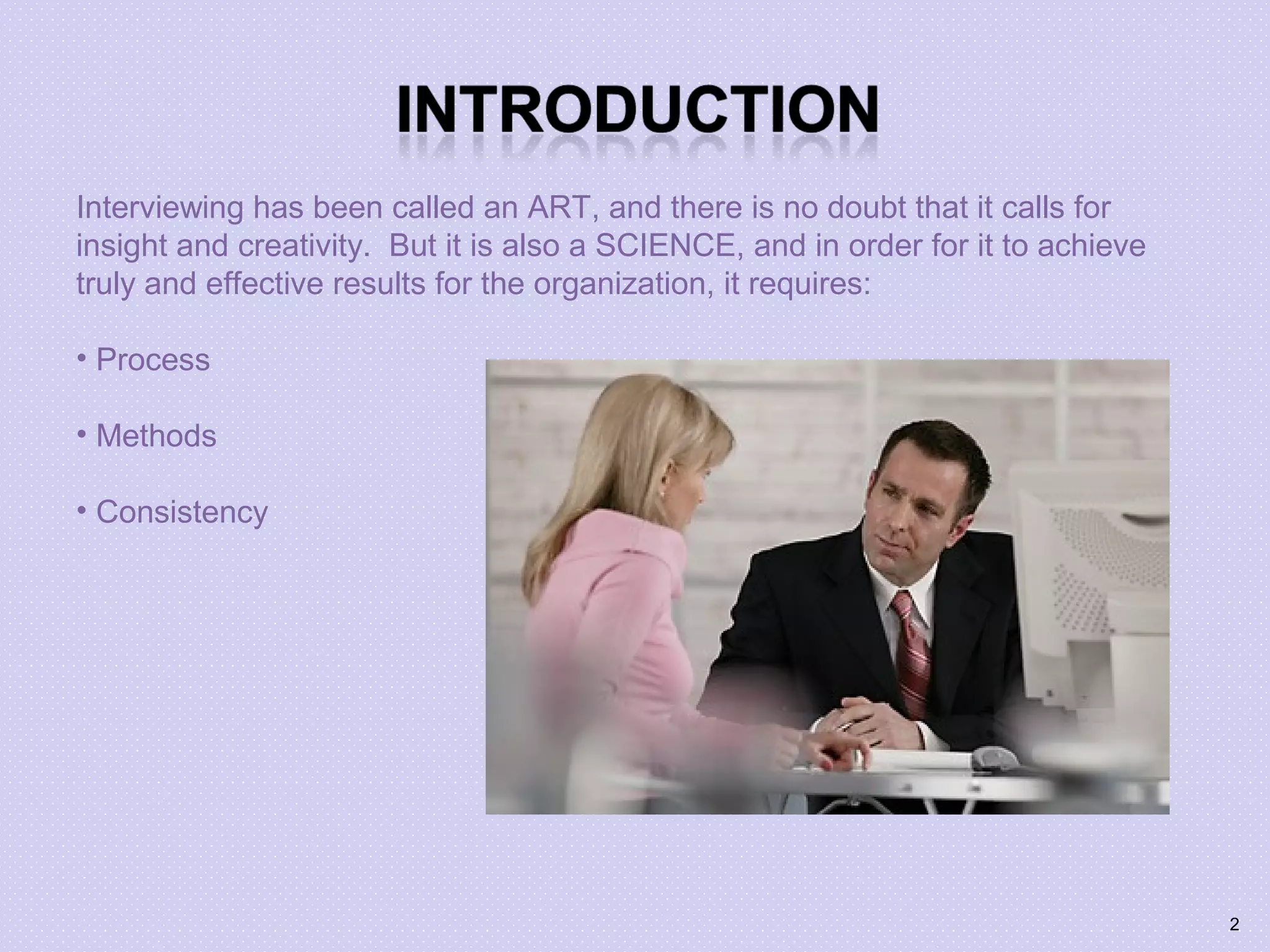 This document provides guidance on conducting effective interviews. It emphasizes that interviewing is both an art and a science that requires preparation, structure, and consistency. Key recommendations include defining interview objectives in advance, selecting interview questions to evaluate essential skills, building an interview team for balanced perspectives, following legal guidelines, comparing notes after interviews, and creating a positive impression of the organization through a professional process.