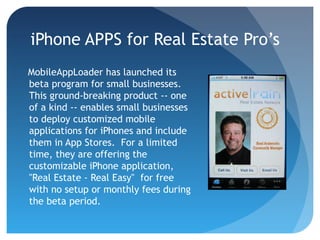 The document discusses a customizable mobile application for iPhones developed by MobileAppLoader specifically for small businesses, particularly in the real estate sector. During their beta program, they offer the 'Real Estate - Real Easy' app for free, with no setup or monthly fees. The service aims to enhance customer engagement by enabling professionals to create and deploy personalized apps, backed by positive feedback on the company's customer service.