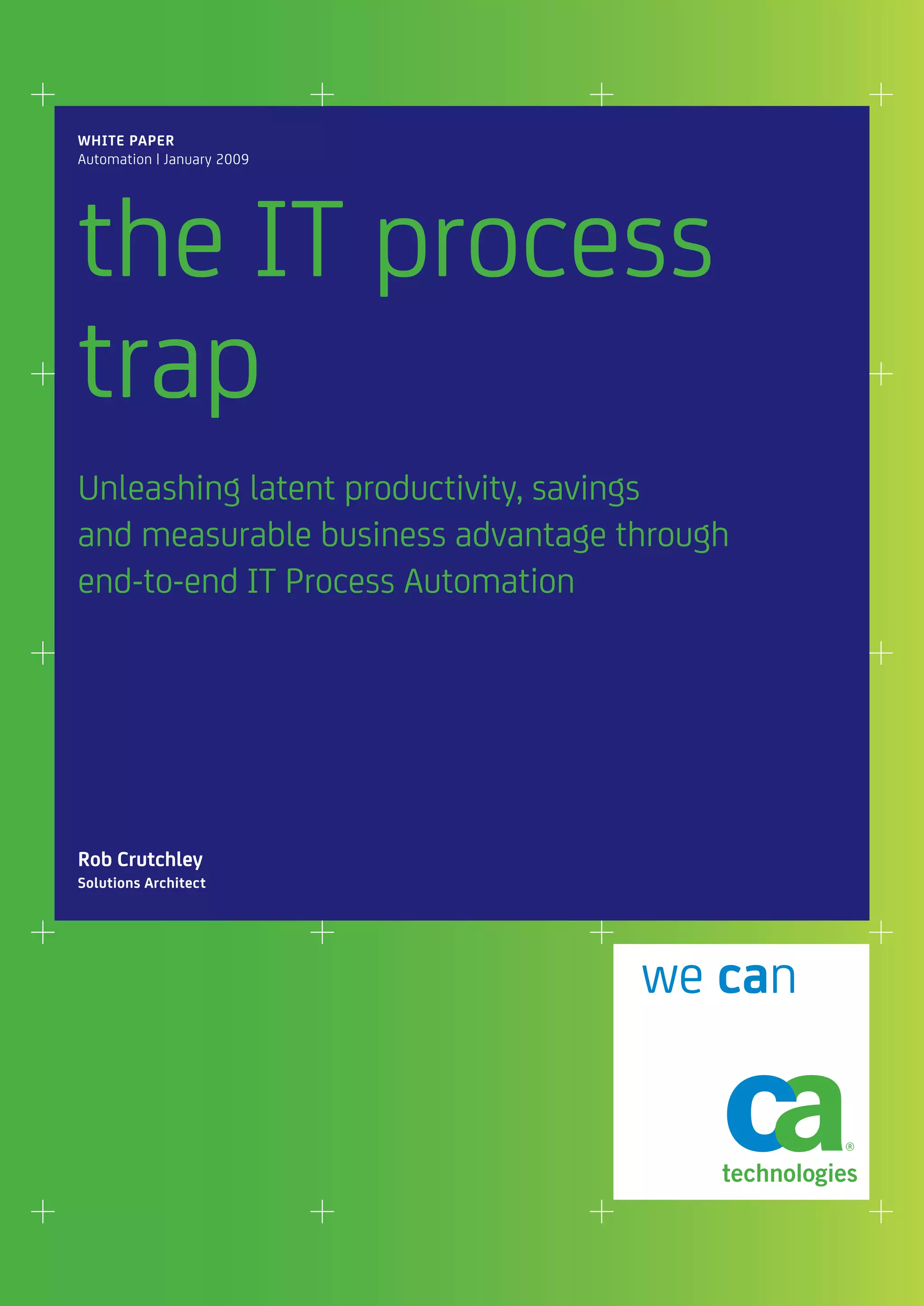This document discusses opportunities for automating IT processes to increase productivity and business agility. It argues that many core IT processes remain inefficient, hindering an organization's ability to respond quickly to market changes. However, a new approach called end-to-end IT Process Automation can eliminate bottlenecks, cut costs and delivery times, boost staff morale and directly contribute to business goals. The document provides an example of a company that automated a technology supply process, reducing effort from over a month to less than a day and slashing delivery times.