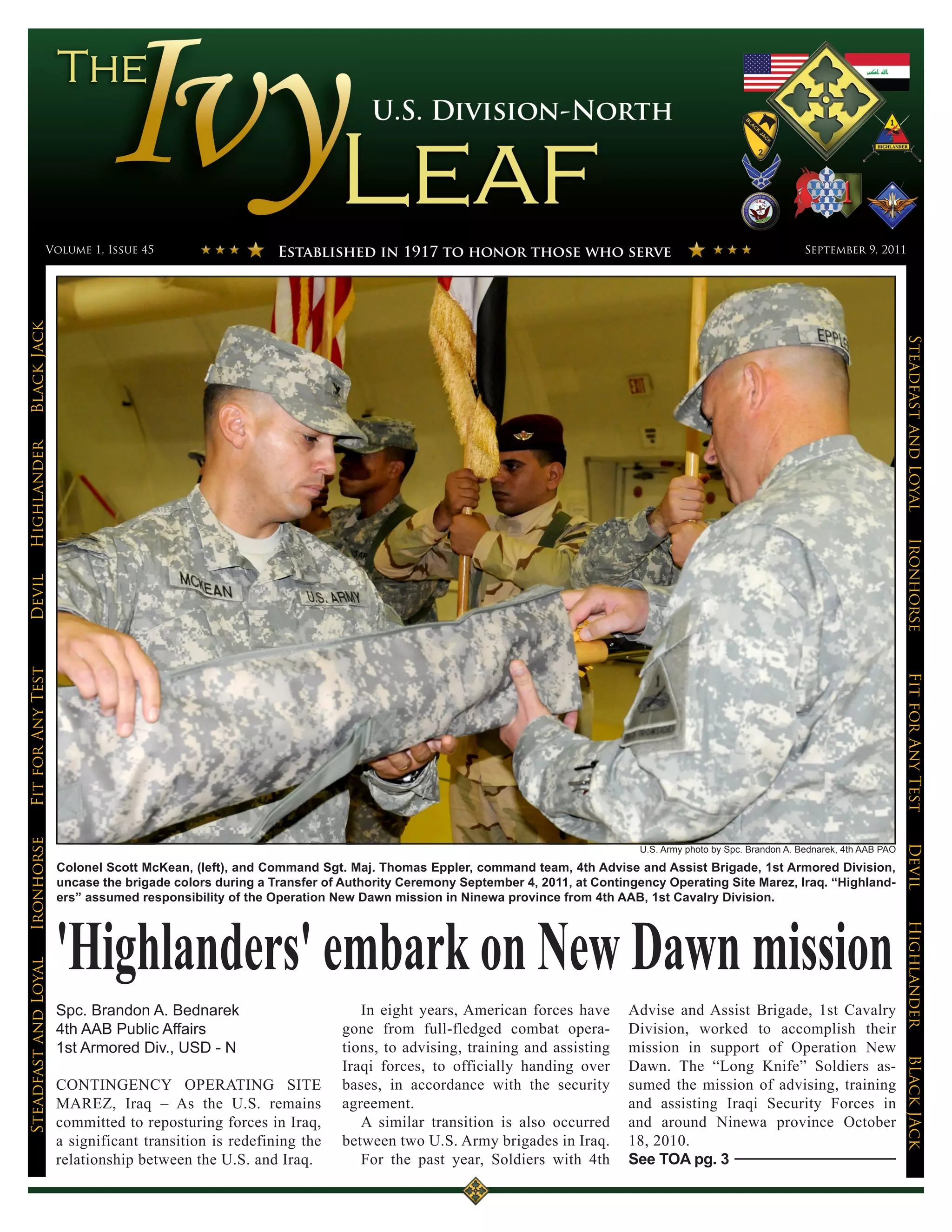 The document summarizes the transition of responsibilities between two US Army brigades, the 4th Advise and Assist Brigade, 1st Armored Division and the 4th Advise and Assist Brigade, 1st Cavalry Division, in Iraq. It describes how the 4th AAB, 1st Cavalry Division had been advising and assisting Iraqi security forces for the past year and was transferring authority to the 4th AAB, 1st Armored Division on September 4, 2011. It also briefly mentions stories about an Army platoon sergeant who teaches classes to improve soldiers' exam scores and a maintenance platoon that trains Iraqi army soldiers.