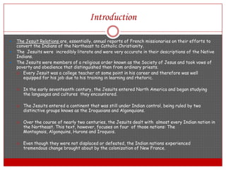 The document discusses four chapters from "The Jesuit Relations" about Native American tribes in Northeastern North America. It focuses on the Montagnais, Algonquins, Hurons, and Iroquois. The chapters discuss the tribes' religious beliefs and practices, their experiences with disease and medicine, and the impact of war and diplomacy between the tribes. The Jesuit missionaries worked to convert the tribes to Catholicism but faced many challenges from language and cultural barriers, traditional spiritual practices, and the effects of war and epidemics on the tribes.