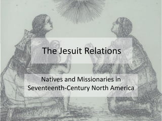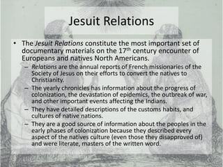 The Jesuit Relations constitute the most important set of documentary materials on the 17th century encounter between Europeans and Native Americans in North America. The annual reports of French Jesuit missionaries provide detailed descriptions of native cultures and customs, as well as information on colonization efforts. The Jesuits focused their missionary work on the Huron, Iroquois, Montagnais and Algonquin nations. Their reports offer insights into native ways of life before increasing European influences like epidemics and trade disrupted traditional practices and worldviews.
