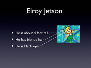 Elroy Jetson is a 4-foot tall boy with blonde hair and black eyes who lives in Orbit City in the year 2062. He attends Little Dipper School where he studies space history, astrophysics and star geometry. Both his father and sister think highly of him, with his father viewing him as a great kid and super student, and his sister seeing him as an awesome brother who is a genius.