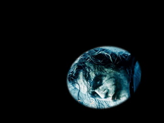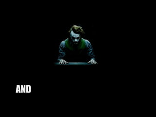 The document provides tips for presentations in the style of the Joker from Batman. It emphasizes using catchy phrases, vivid personal stories, and thinking big to achieve goals. It also advises presenters to break rules and conventions and to stand out from others by being different.