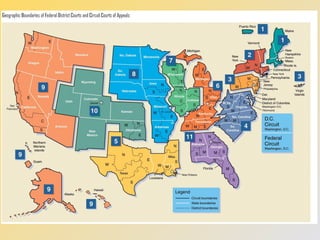 The federal court system is established by Article III of the Constitution. The federal courts have jurisdiction over cases involving the Constitution, federal law, disputes between states or citizens of different states, and disputes involving foreign governments. The lower federal courts include district courts and courts of appeals. District courts handle most cases and have original jurisdiction, while courts of appeals only hear appeals from lower courts. The highest court is the Supreme Court, which has the power of judicial review to determine the constitutionality of laws and final authority on interpreting the Constitution.