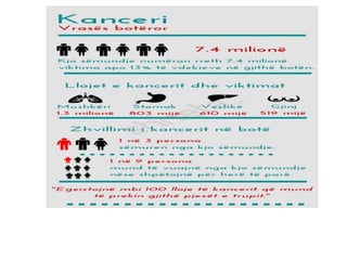 Cancer is a group of diseases caused by uncontrolled cell growth. The document discusses several types of cancer including breast cancer, bladder cancer, lung cancer, lymphoma, liver cancer, stomach cancer, prostate cancer, esophageal cancer, and others. It describes the risk factors, symptoms, and most common forms of each type of cancer. It also discusses how cancer cells spread, what tumor cells are, how stomach cancer is treated, and 12 types of cancer that can be inherited genetically.