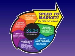 KDM P.O.P. Solutions Group provides speed-to-market solutions for the point-of-purchase industry from its 155,000 square foot production facility in Cincinnati, Ohio. It has over 250 dedicated employees and offers sustainable printing, packaging, and shipping solutions. KDM has expertise in custom display design and fabrication, volume purchasing and plastic distribution, and flexible manufacturing including various printing methods, plastic fabrication, finishing, kitting, and distribution.