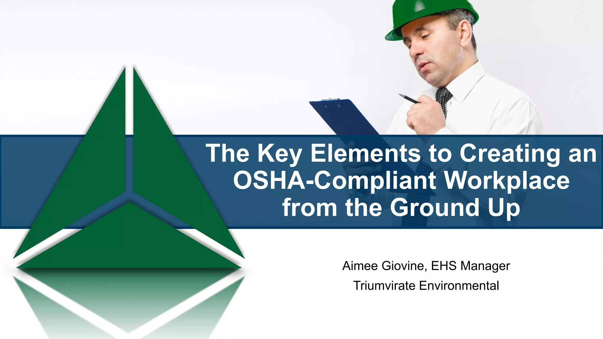 The document discusses the key elements to creating an OSHA-compliant workplace from the ground up, including assessing the workplace for compliance, developing plans and prioritizing areas to become compliant, and maintaining compliance through ongoing training, inspections, and documentation. It emphasizes the importance of management support, developing proper procedures, training employees, and working with experts to ensure all OSHA standards applying to the workplace are addressed.