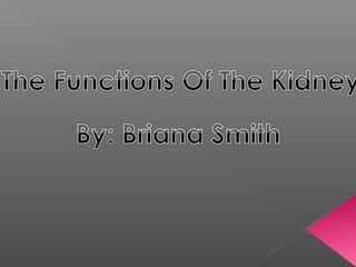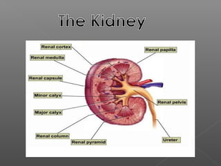 The kidney is an organ that filters waste from the blood and regulates fluid balance. It contains an outer cortex and inner medulla. Blood enters via the renal artery and leaves via the renal vein after being filtered through nephrons. Urine is drained from the kidney through the ureter into the bladder. Kidney functions include filtering waste, regulating minerals and producing hormones. Kidney diseases can be acute or chronic and cause injury or failure requiring dialysis or transplant. Kidney stones form from minerals in the urine.