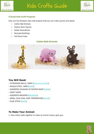 The document lists five easy kids' craft projects: cotton ball animals, festive stick figures, Easter decorations, recycled buildings, and a felt pencil case. Each project includes a detailed materials list and step-by-step instructions for creation. The materials are readily available at local craft shops or online.