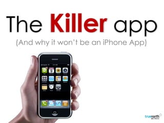 The document discusses how marketers are seeking the "killer app" for the iPhone but raises questions about the sustainability and audience reach of iPhone apps. It notes that iPhone apps see steep usage declines over time and have limited audiences due to the small percentage of iPhone users. The document then argues that SMS provides a more effective and affordable "killer app" for mobile marketing by allowing customizable, incentivizing messages that can reach all mobile users, not just iPhone owners.