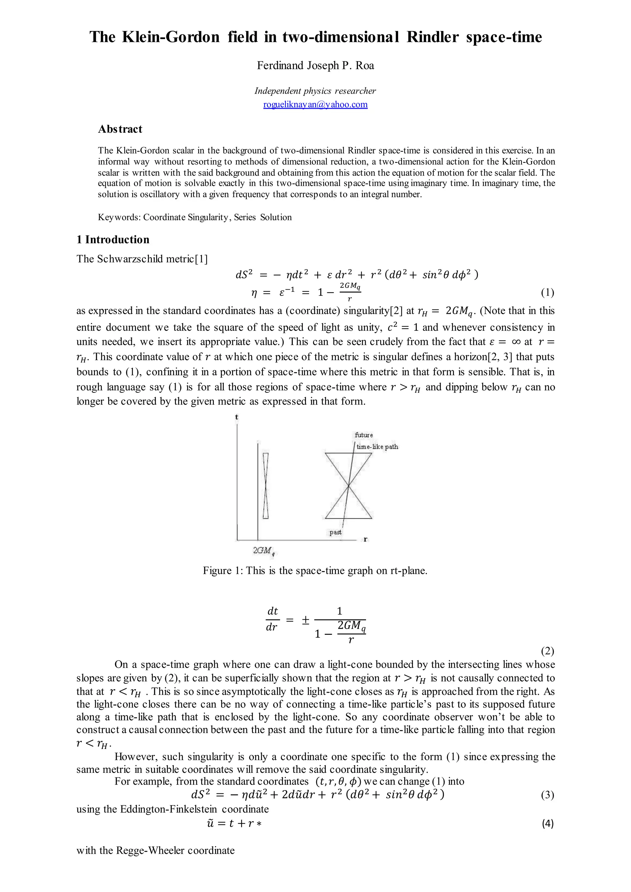 1) The document considers a Klein-Gordon scalar field in a two-dimensional Rindler space-time background.